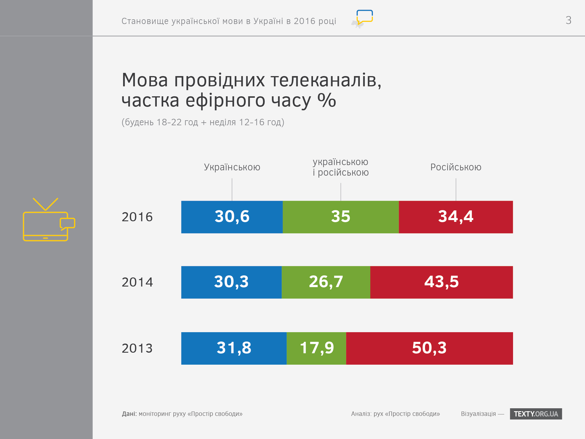 У прайм-тайм 7 найрейтинговіших телеканалів українська мова звучить лише 30,6%часу, російська – 34,4%. Решту 35% займають двомовні ефіри, під час яких також найчастіше домінує російська мова.