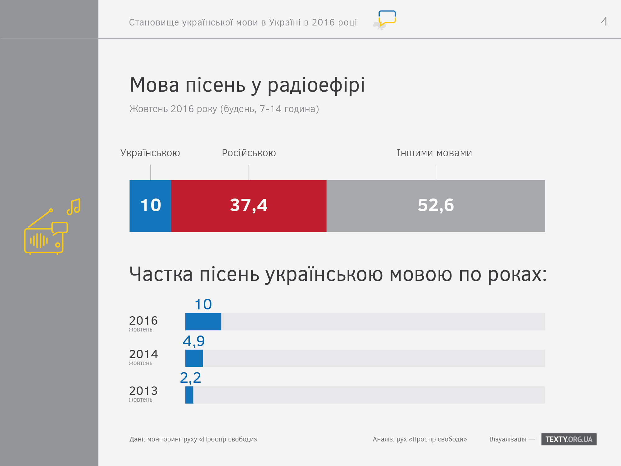 Осінь 2016 року позначилася зростанням частки пісень українською мовою в радіоефірі. У жовтні ця частка сягнула 10% (удвічі більше, ніж 2014 року), а у листопаді очікується її зростання до передбачених новим законом 25%.