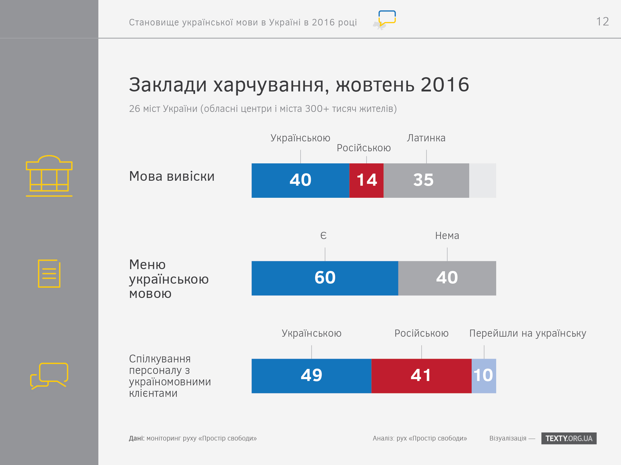 За підсумками моніторингу кафе і ресторанів у 26 містах (усі обласні центри, крім окупованих, а також Кривий Ріг, Маріуполь, Краматорськ та Сєверодонецьк) лише 40% закладів харчування мають українську вивіску, лише в 60% надруковано меню українською і тільки в 49% закладів персонал обслуговує україномовних клієнтів українською мовою.