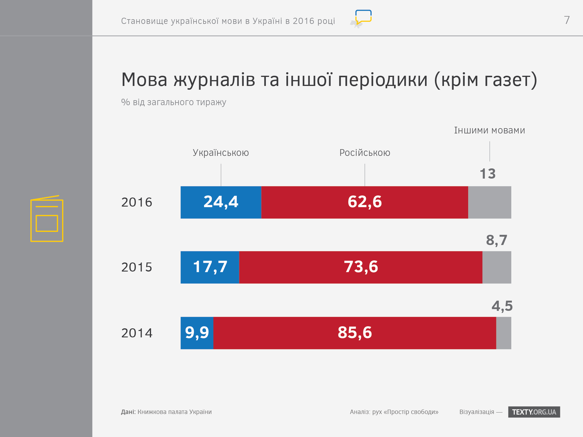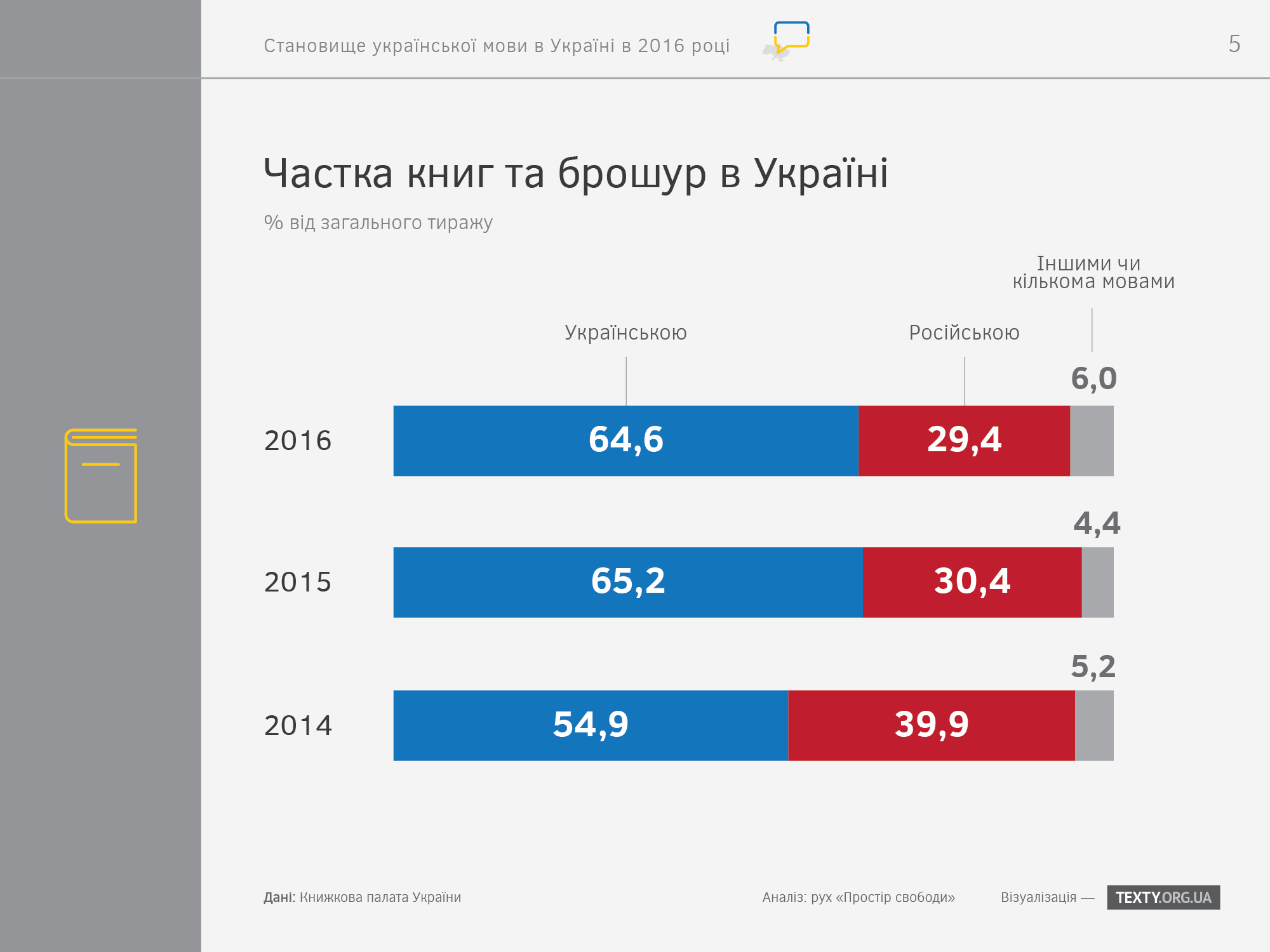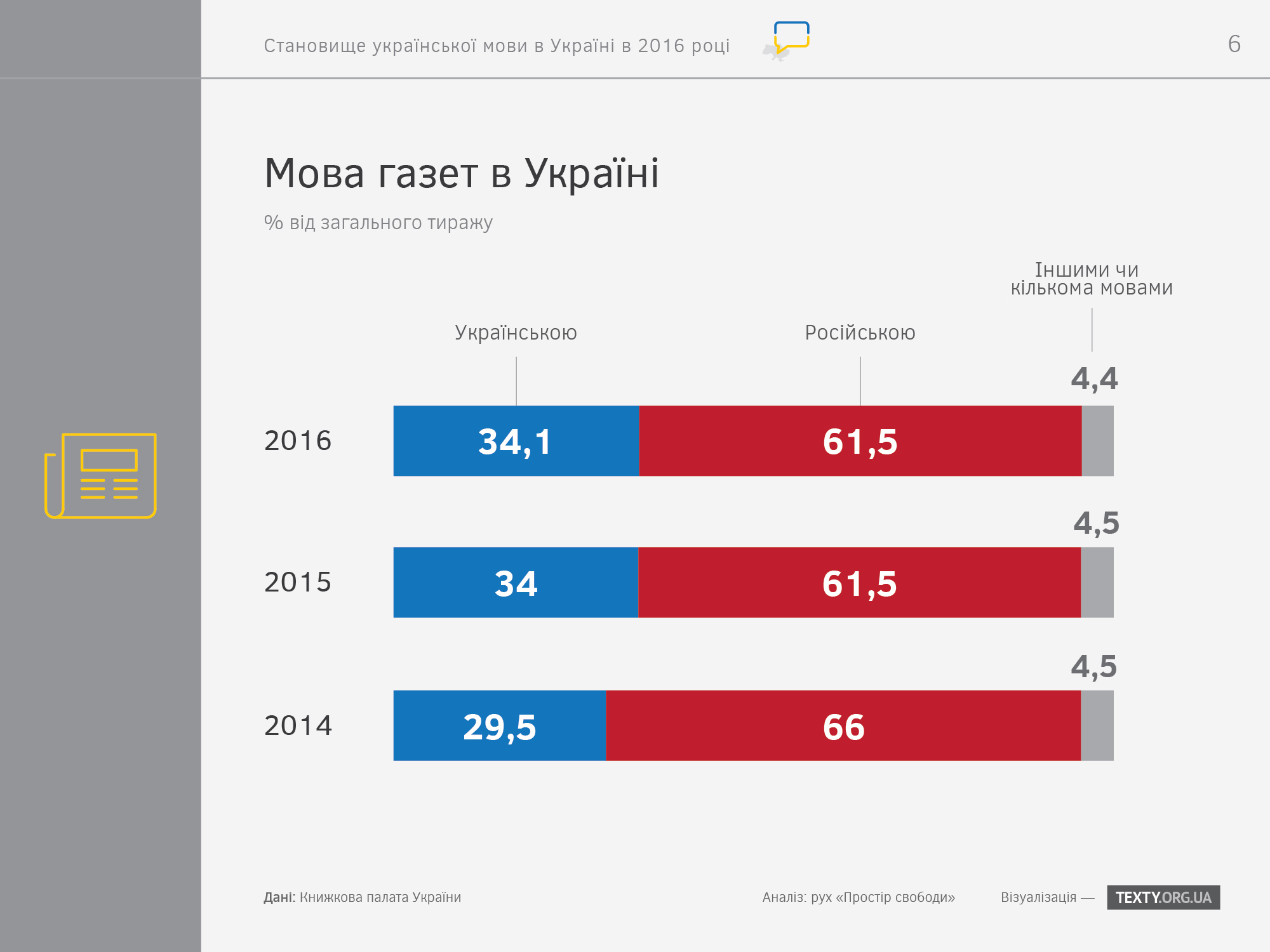 Частка газет, що видаються українською мовою, не змінилася і становить лише 34%, частка від загального тиражу книг – 64%.